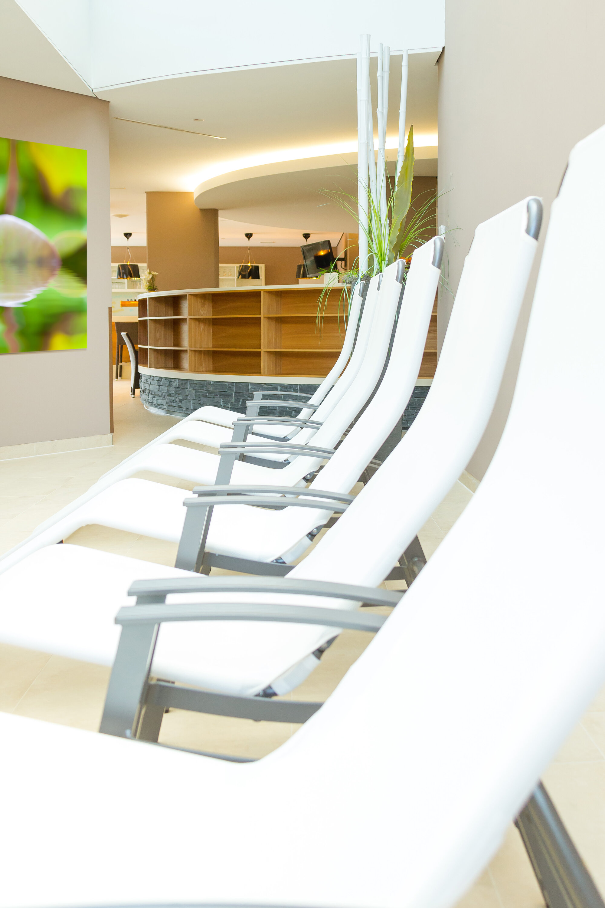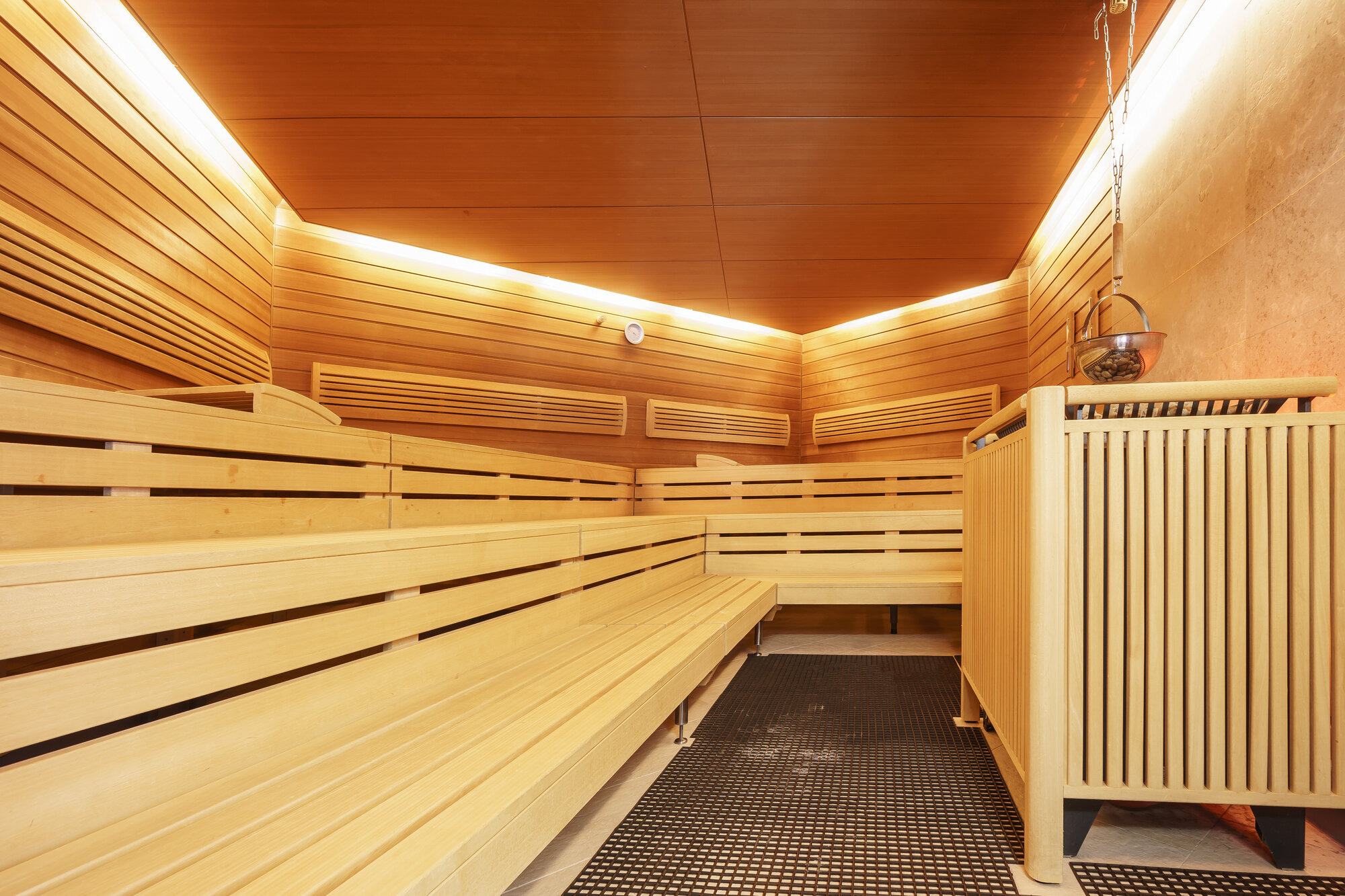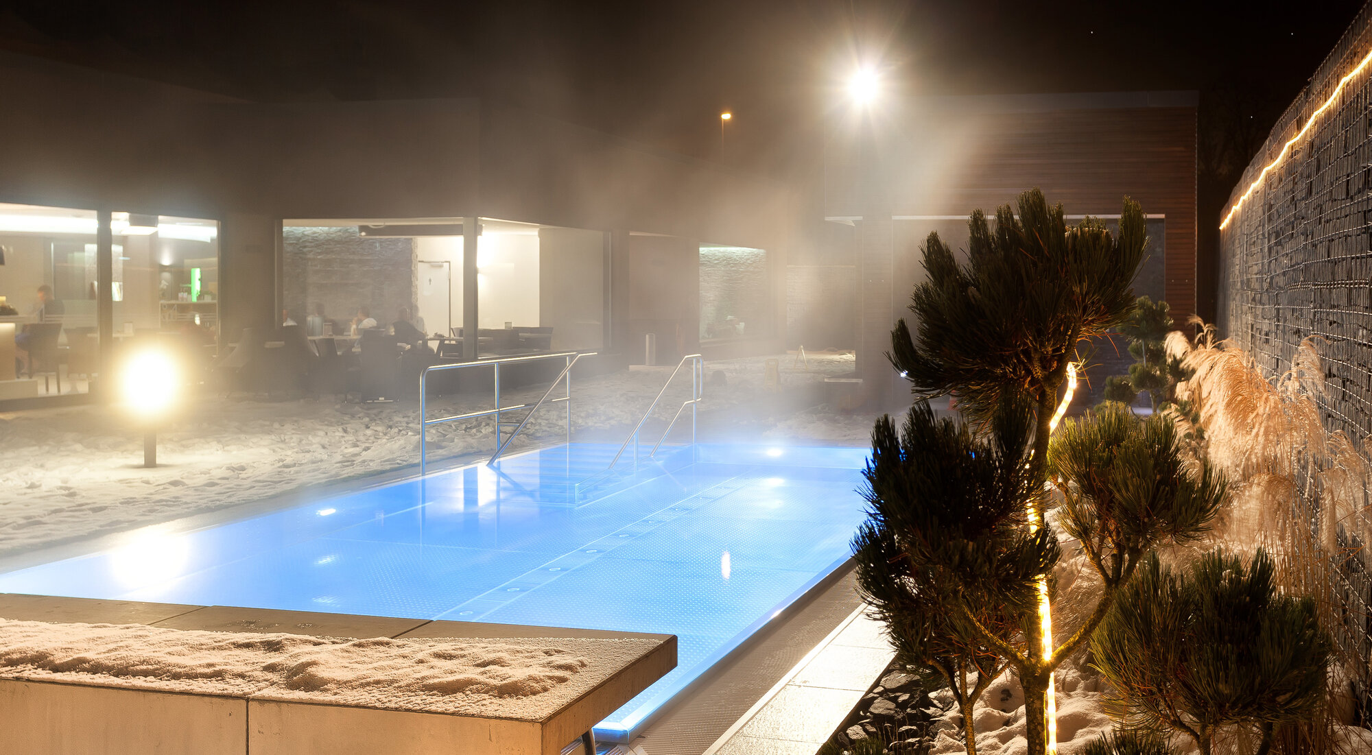 Besonders eindrucksvoll war die eigenständige Saunalandschaft mit Aufguss-, Bio- und Dampfsauna sowie einer finnischen Sauna mit Außenschwimmbecken im Saunagarten. Architektonisch stand hier das Thema „Feuer und Stein“ im Mittelpunkt. Drei Erdgaskamine sorgten zusätzlich für wohlige Wärme und eine besondere Atmosphäre.