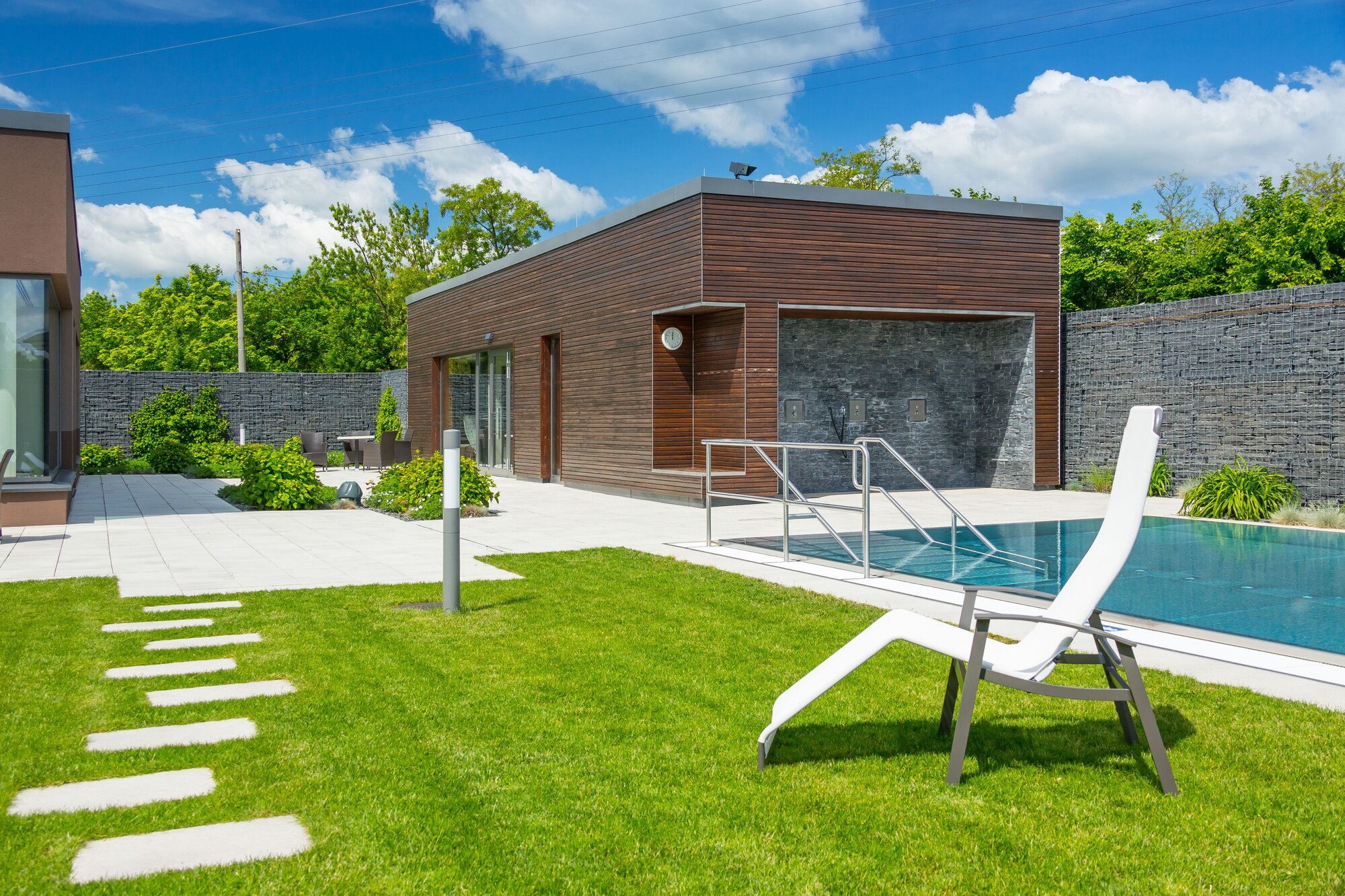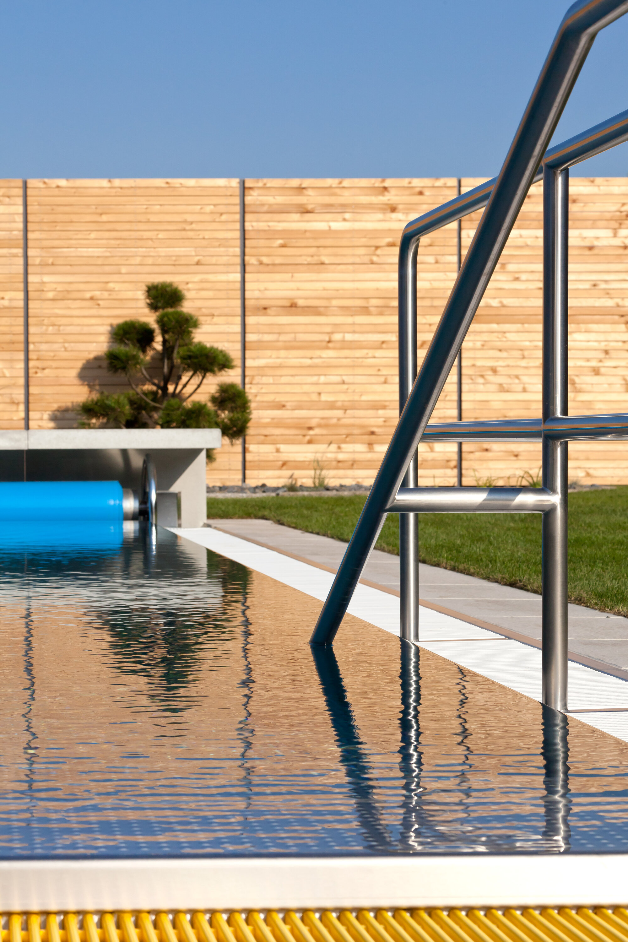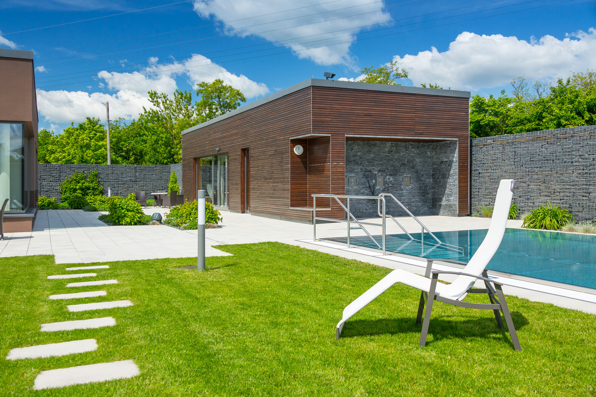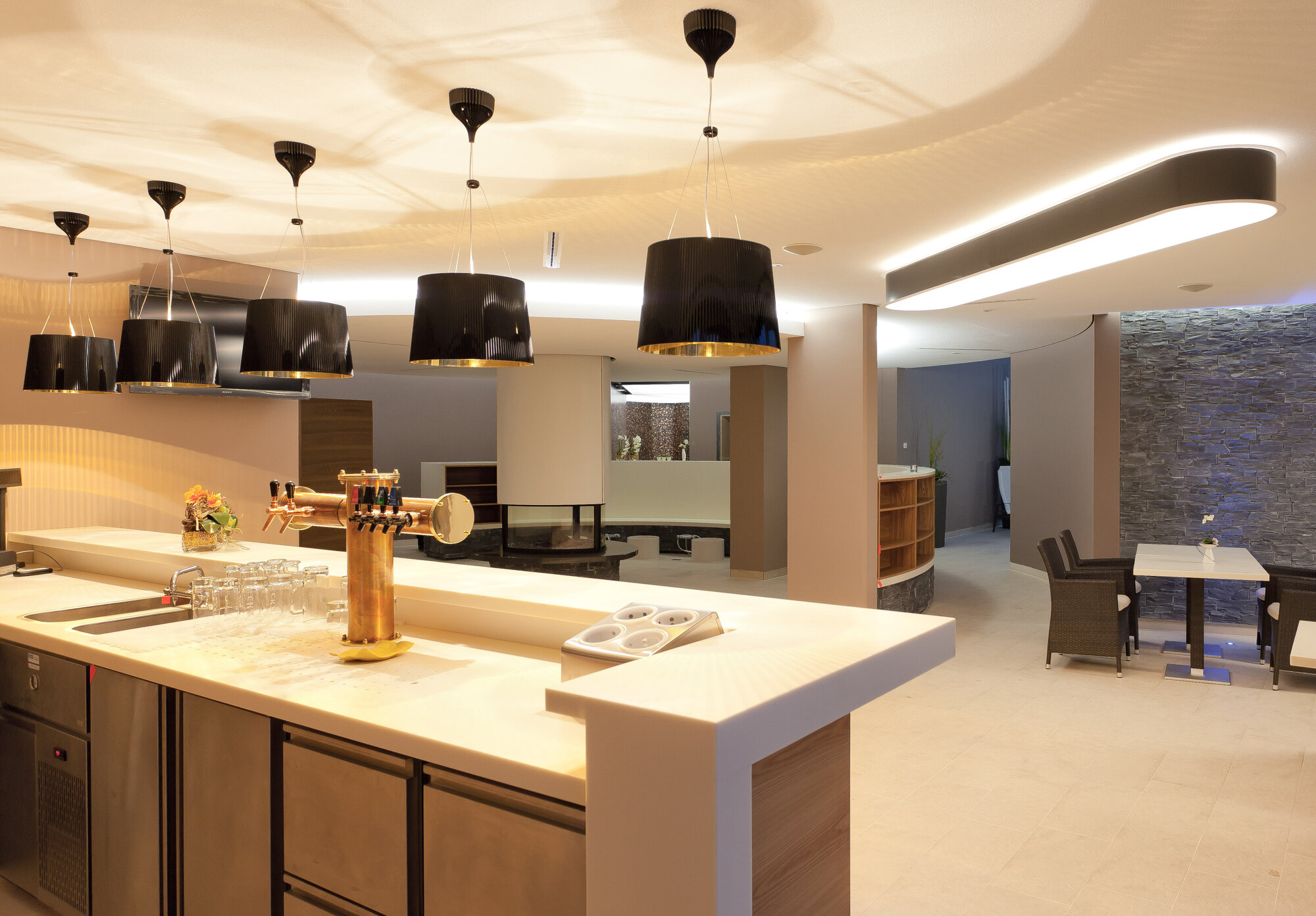 Besonders eindrucksvoll war die eigenständige Saunalandschaft mit Aufguss-, Bio- und Dampfsauna sowie einer finnischen Sauna mit Außenschwimmbecken im Saunagarten. Architektonisch stand hier das Thema „Feuer und Stein“ im Mittelpunkt. Drei Erdgaskamine sorgten zusätzlich für wohlige Wärme und eine besondere Atmosphäre.